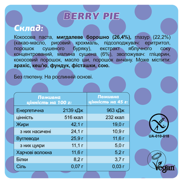 Склад: кокосова паста, мигдалеве борошно (26,4%), глазур (22,2%) (какао-масло, рисовий крохмаль, підсолоджувач: еритритол, порошок сушеного буряку), екстракт яблучного соку концентрований, малина сушена (6%), зволожувач: гліцерин, кокосовий порошок, масло ши, порошок анчану.