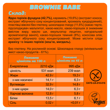 Склад: ядра горіхів фундука (42,7%), карамель (19,6%) (екстракт кокоса, екстракт яблучного соку концентрований, крохмаль кукурудзяний), пластівці вівсяні без глютену, шоколадна глазур (11,6%) (какао терте, підсолоджувач мальтитол, какао-масло, какао-порошок зі зниженим вмістом жиру, масло ши, емульгатор лецитин, натуральний ароматизатор ванілі), какао-порошок темний (8%), кокосова олія, екстракт яблучного соку концентрований.