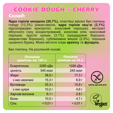 Склад: ядра горіхів мигдалю (26,7%), пластівці вівсяні без глютену, глазур (13,3%) (какао-масло, підсолоджувач еритритол, ядра горіхів кеш’ю (2,2%), кокосовий порошок, крохмаль кукурудзяний, лецитин соняшниковий), екстракт яблучного соку концентрований, кокосова олія, кокосовий порошок, сублімована вишня (3,4%), хрусткі кульки (3,1%) (амарантове борошно, кукурудзяне борошно), порошок сушеного буряку.