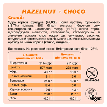Склад: ядра горіхів фундука (47,8%), ізолят протеїну горохового (18,7%), екстракт яблучного соку концентрований, шоколадна глазур (11,8%) (какао терте, підсолоджувач мальтитол, какао-масло, какао-порошок зі зниженим вмістом жиру, масло ши, емульгатор лецитин, натуральний ароматизатор ванілі), масло ши.